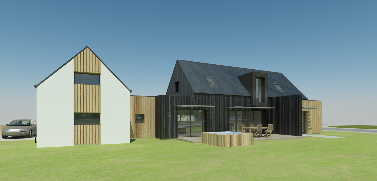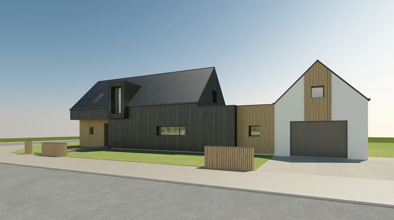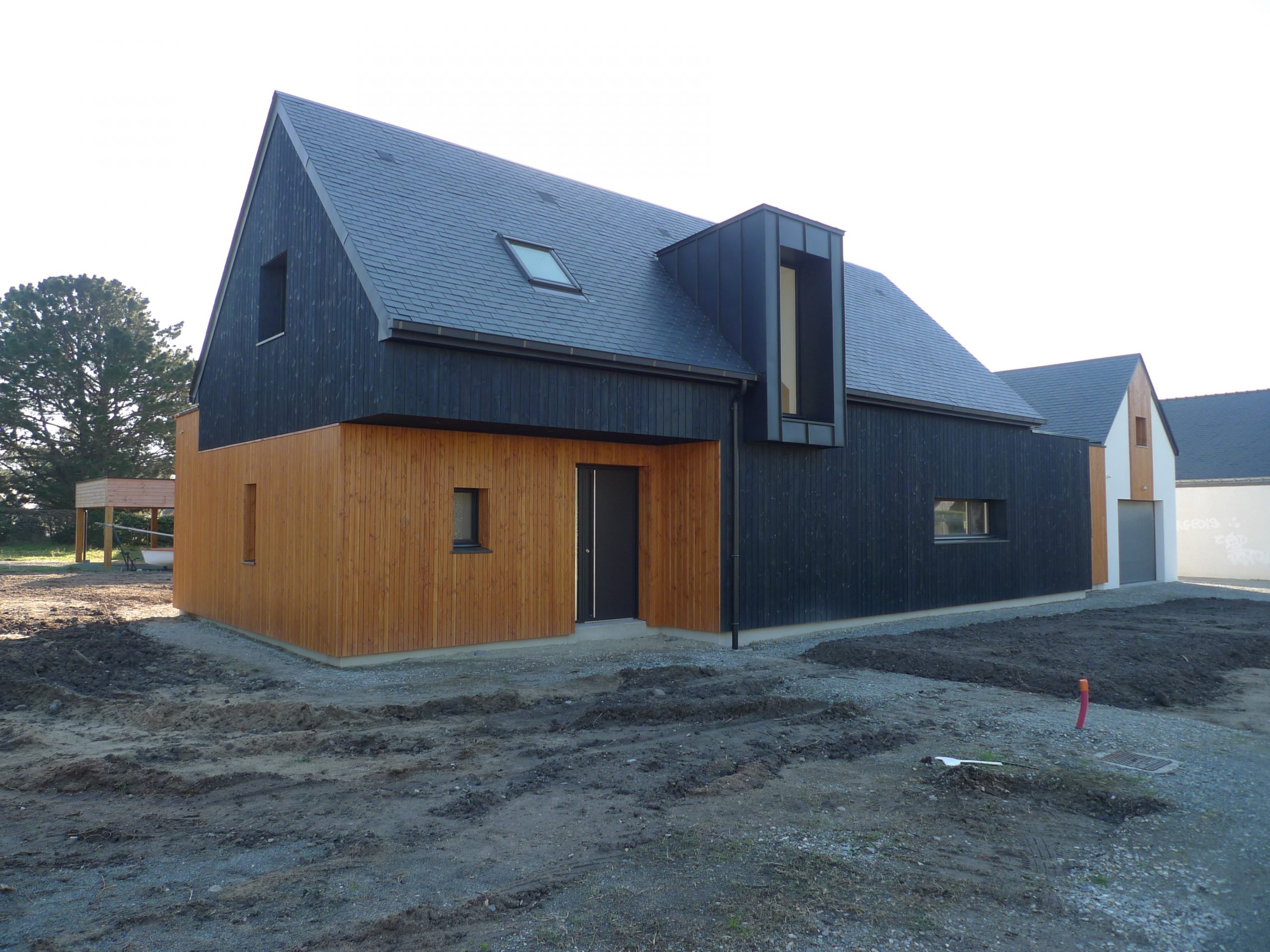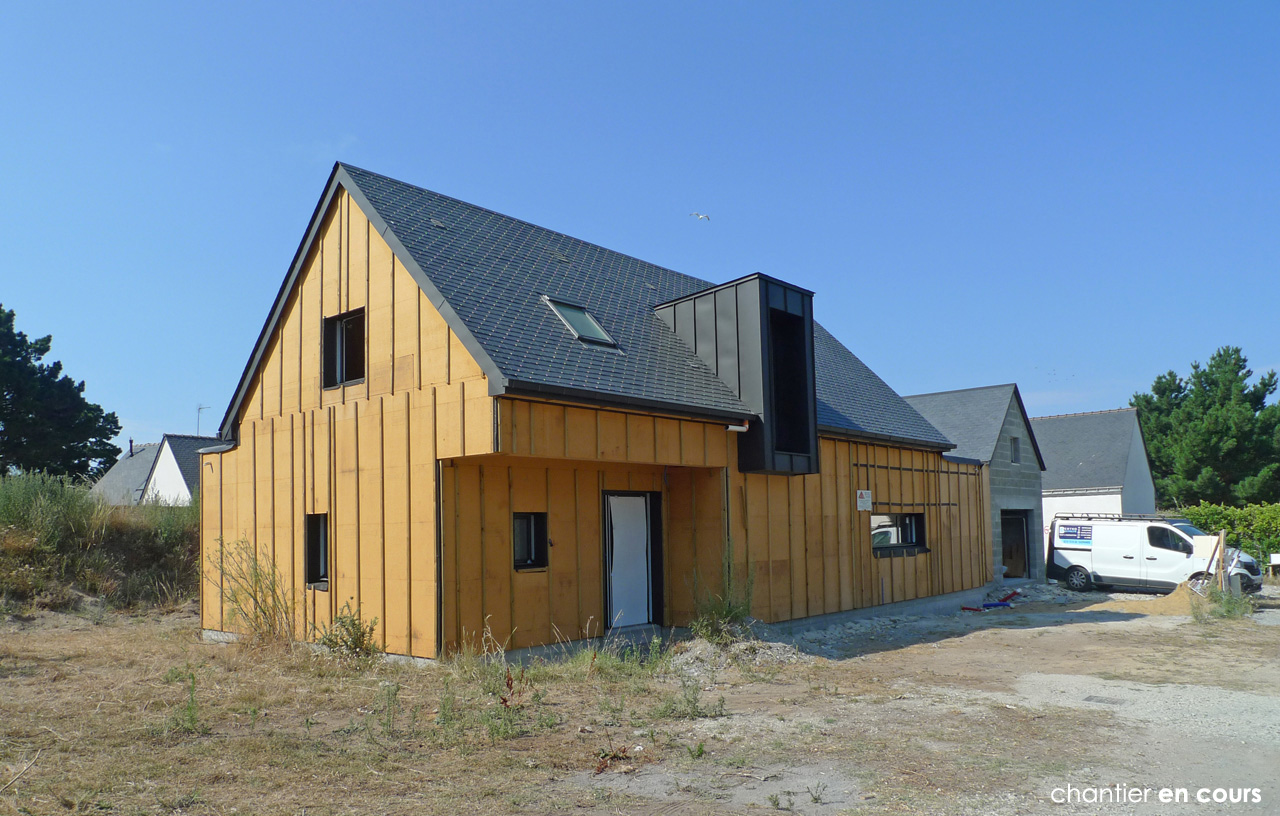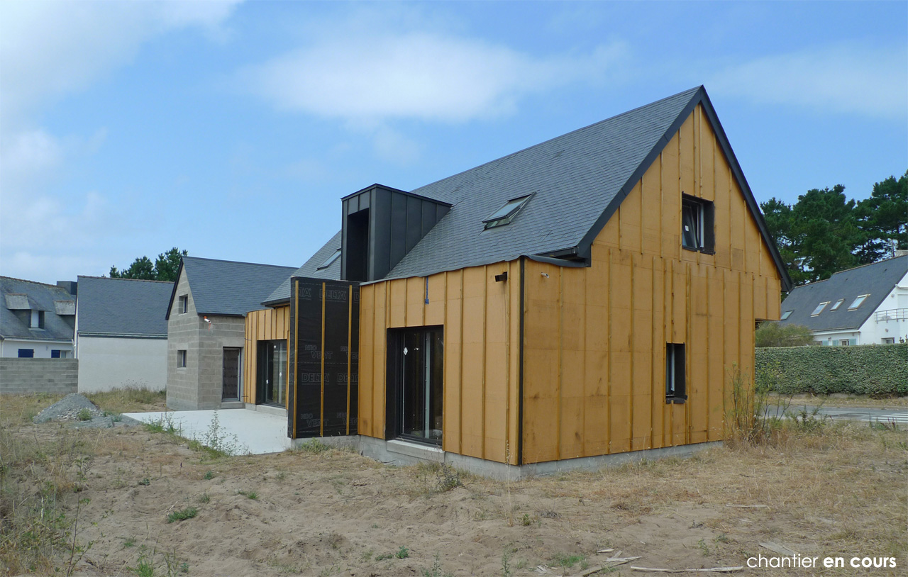 Ossature Bois / Isolation mixte Fibre de bois et isolants minéraux / Menuiseries Alu vitrage basse émissivité / Etanchéité à l’air (classification RT2012) / bardage bois écothermo et naturel / lucarnes zinc anthra